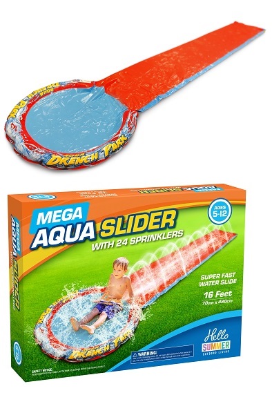Description: Hello summer Mega Aqua Water Slider with 24 Sprinklers and Splash Zone- 16 FeetFeatures:Slide your way through the summer with this mega aqua water Slide!This slide connects to a standard hose and features an inflatable pad to cushion and water sprayers to slide through!- New 16ft 3-in-1 aqua slider with water sprinklers and splash zone - Now everyone can get in on the act with this 3-in-1 aqua slider - Launch yourself down the super slick 16ft long water slide - Includes a separate splash zone while you wait for your turn for the ultimate slide - Size - 480cm x 70cm (Approx.) - Suitable for ages: 5-12
